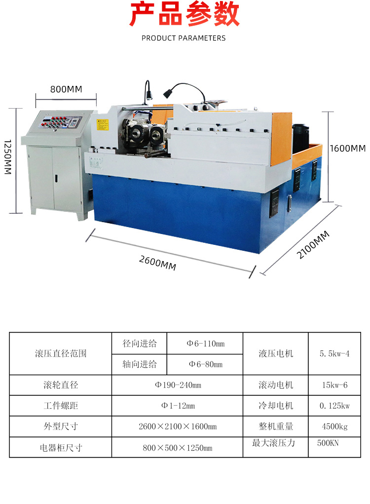 产品特点:本机结构坚固,制造精良,动力强劲主要用于滚压各種(zhǒng)又們较大梯形螺纹,模数螺纹及高强度标准件。适应滚压的材料;延伸空相率大于10%,抗拉强度小于100N/mm2的各計計種(zhǒng)碳素钢.合金钢及有色金属.